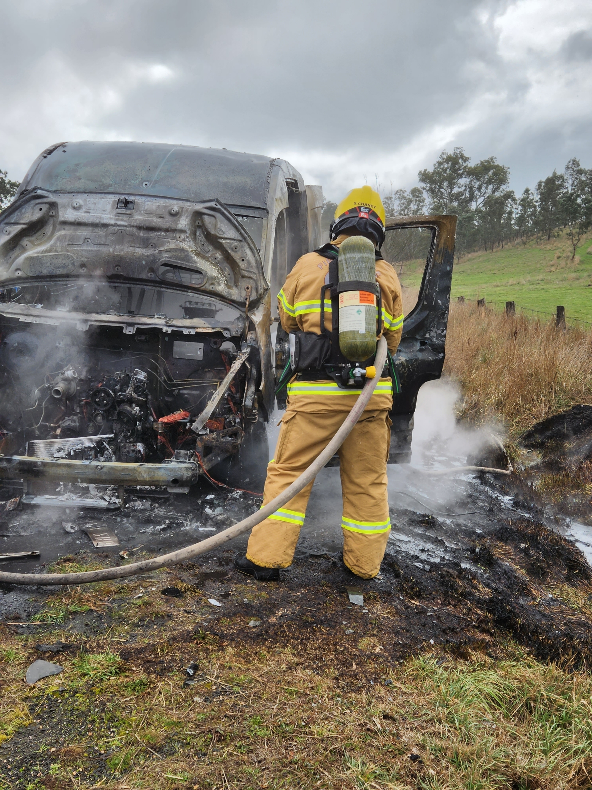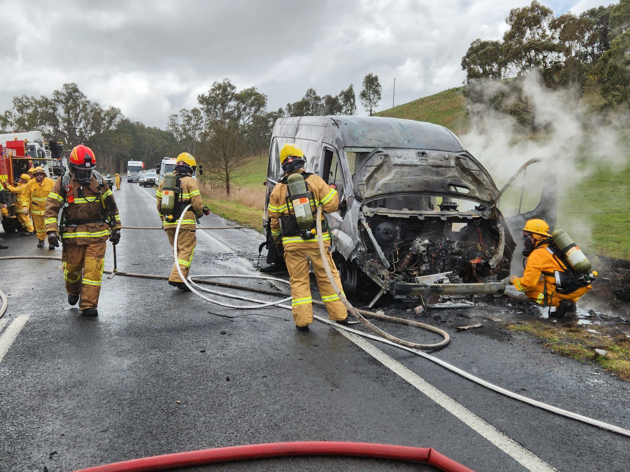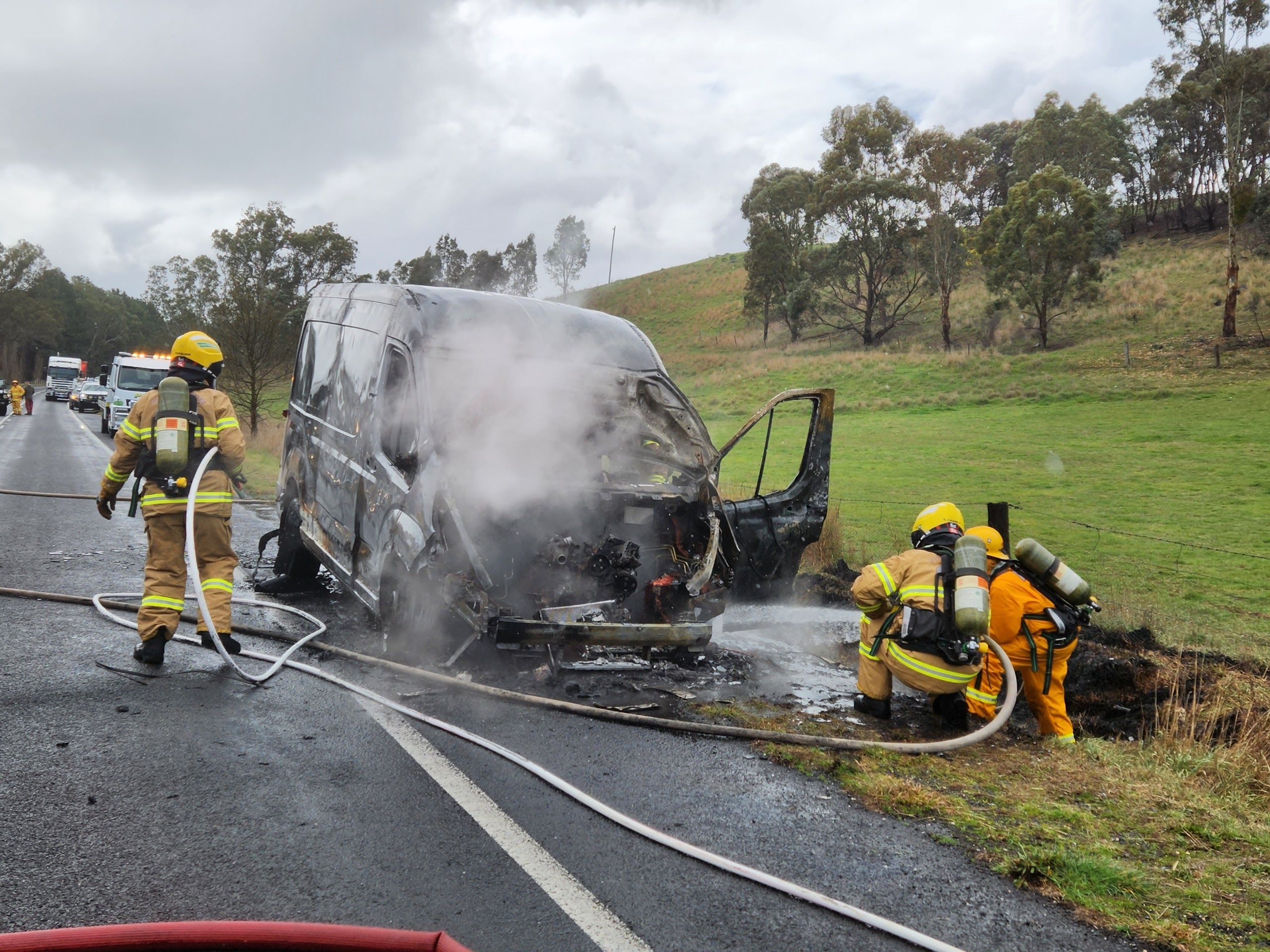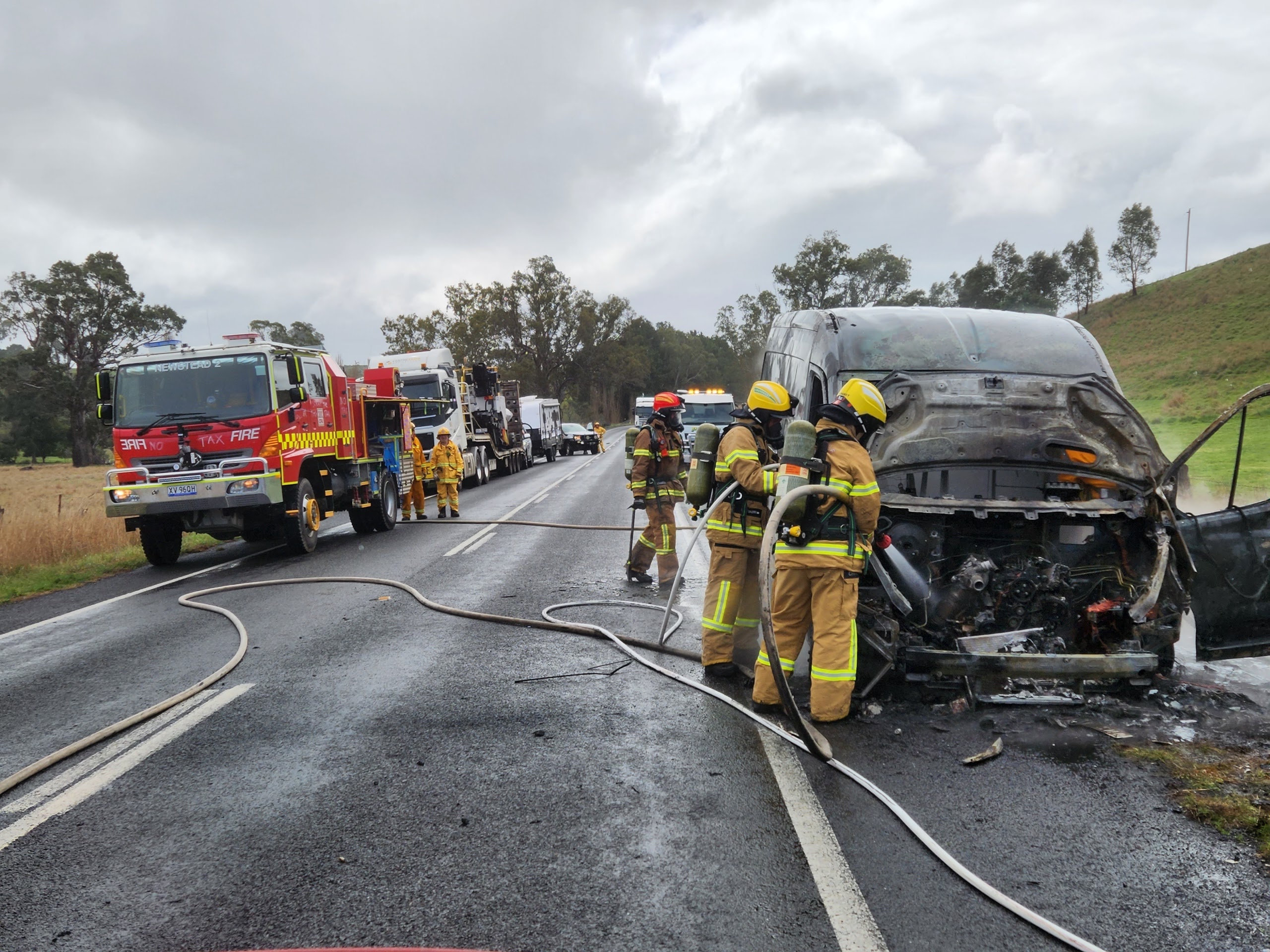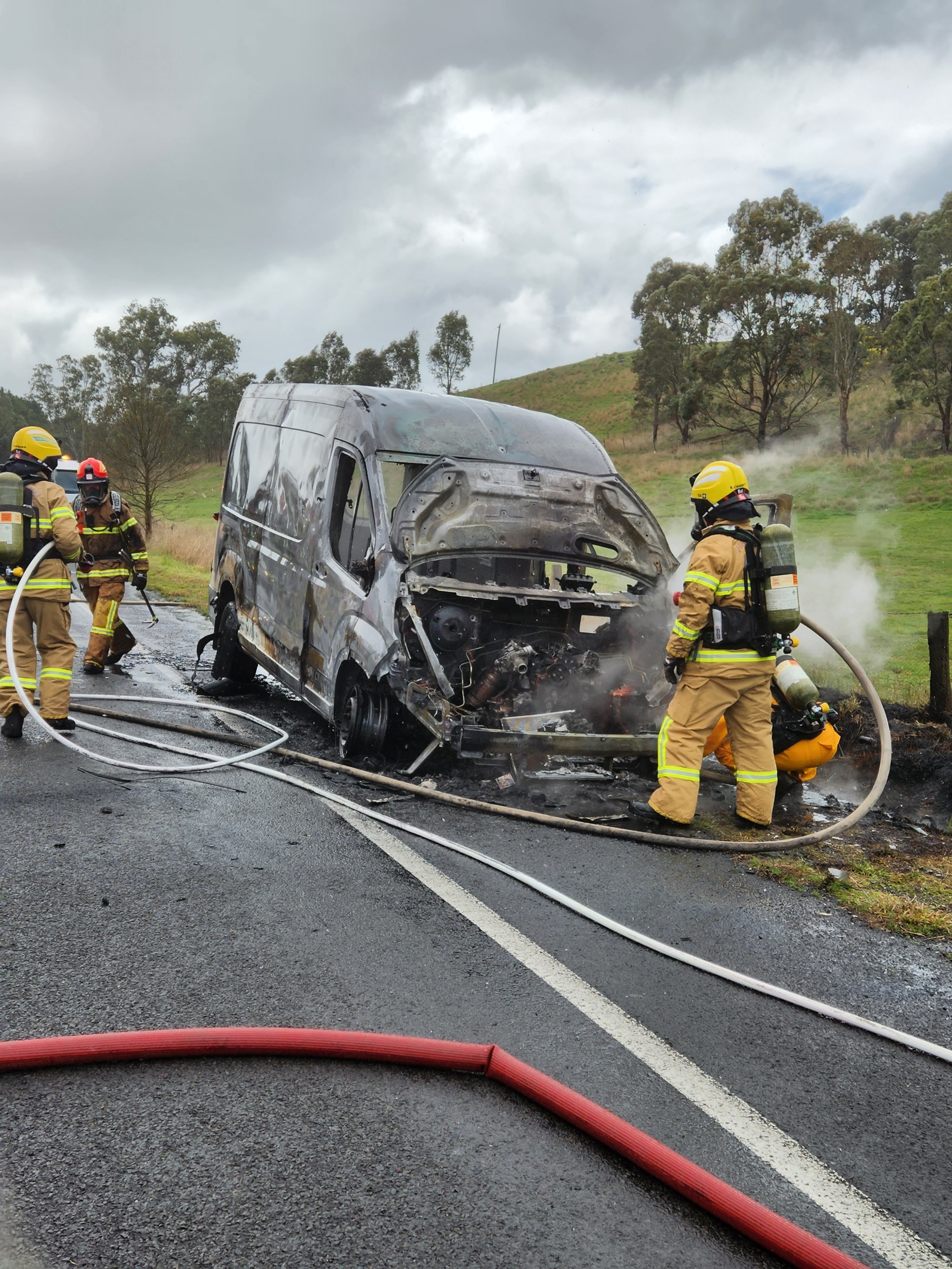 A busy start to September for the brigade with us being paged to another fire just after midday today. This time it was to a diesel powered van on fire at Sandon. No one was injured in the incident however the vehicle was completely destroyed by fire. Crews wearing breathing apparatus were able to quickly extinguish the fire and stop it spreading to nearby grass and bush, assisted by recent rain.