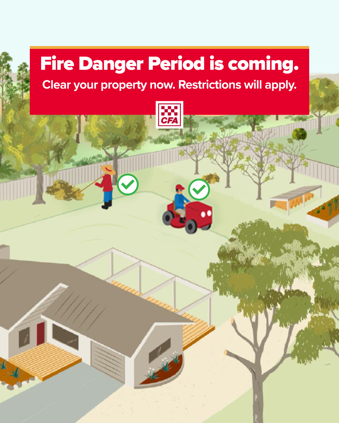 The Fire Danger Period is when CFA restricts the use of fire in the community, which helps prevent fires from starting. CFA declares the Fire Danger Period for each municipality (shire or council) at different times in the lead up to the fire season. It depends on the amount of rain, grassland curing rate and other local conditions – be make sure to check CFA’s website for updates on your local areas restrictions. To find out more visit, About the Fire Danger Period | CFA (Country Fire Authority)